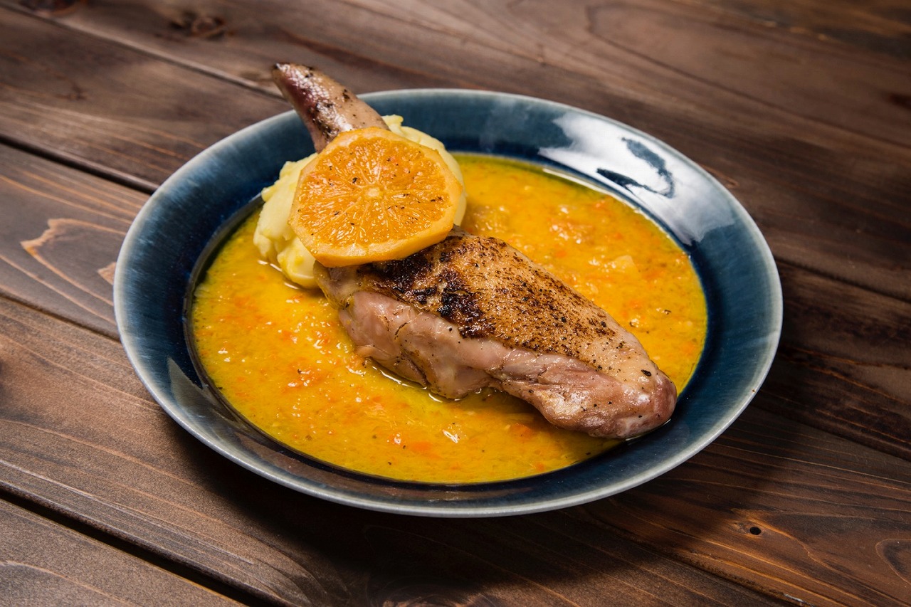 大山鶏のロースト オレンジソース 1,800円(税別)大山鶏の骨付きもも肉をコンフィにし、オーブンでローストし、オレンジソースでさっぱりと仕上げました。 |