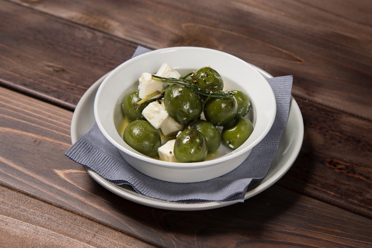 オリーブとフェターチーズのマリネ 850円(税別)ハーブでマリネした2種のオリーブとフェターチーズを合わせました。 |