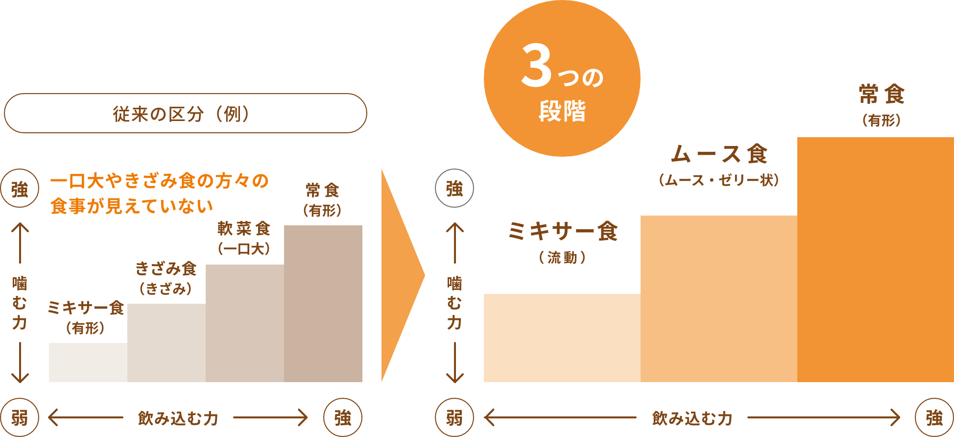 食べる力、飲み込む力の度合いに応じて、食事を3つの階段に分けました。