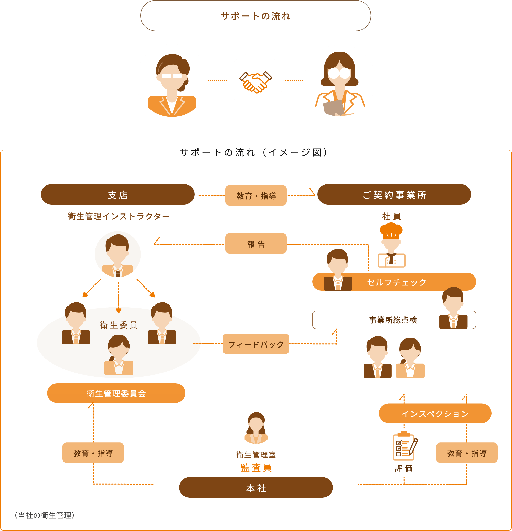 当社の衛生管理においては、本社に設置する「衛生管理室」及び「支店」がご契約事業所先と連携し、