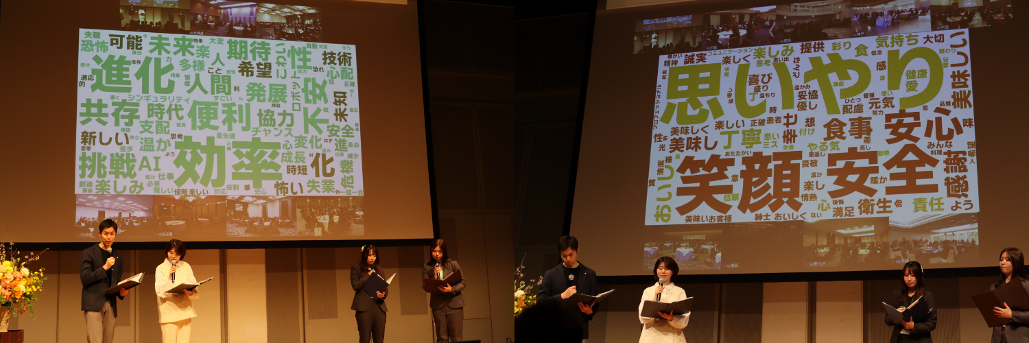 『食の原体験』から『AI時代の最適食』までを新入社員の皆さんが多角的に考察し、最後には『人ならではの温かい食の心』、すなわち当社の事業意義について自ら見出す、発見型入社式企画。先輩社員であり、採用担当者2名が登壇し、思いを語りました。